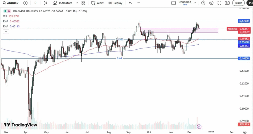 The double top formation effectively connects the September highs with the current trading range, suggesting that the 0.67 level remains a significant ceiling for the pair. Traders are therefore considering the short side of AUD/USD, targeting a decline toward 0.6550, where the 50-day EMA resides.