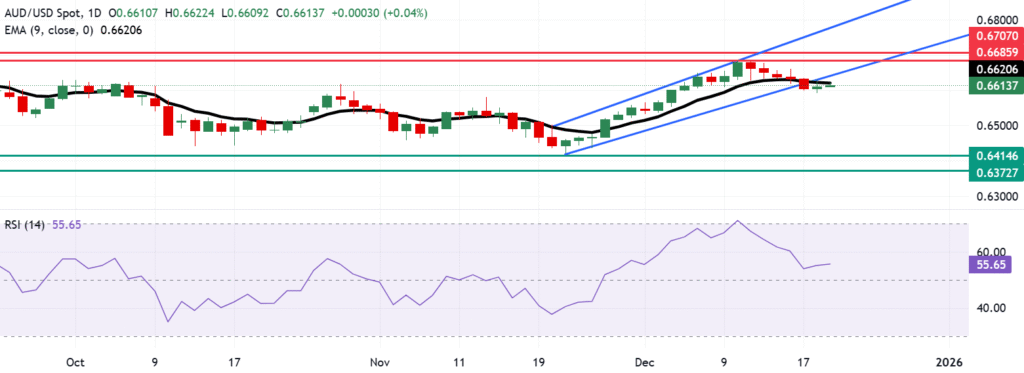 The AUD/USD pair traded below 0.6620, remaining under pressure from the stronger USD. Technical analysis of the daily chart shows the pair below the ascending channel trend, indicating a weakening bullish bias. The nine-day Exponential Moving Average (EMA) sits just above the spot, capping upward attempts.