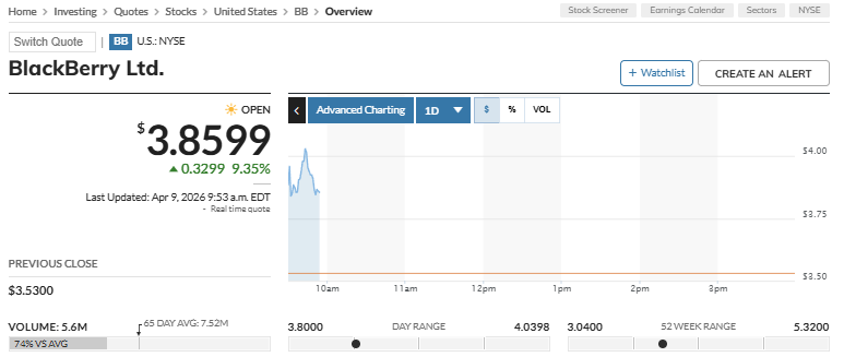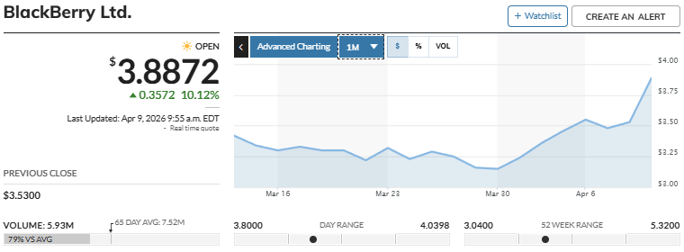 In the latest trading session, BlackBerry shares closed at approximately $3.50, reflecting a daily gain of around 1.45%. This contrasts with declines in major indices, including the S&P 500 and Dow Jones, which both posted modest losses.