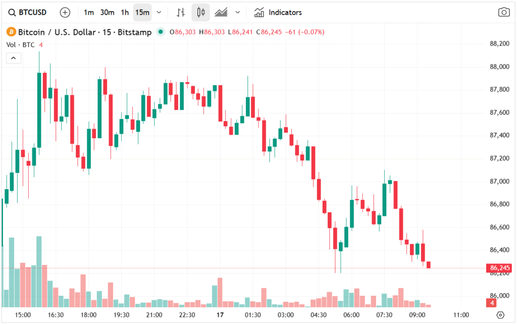 Bitcoin price has remained under pressure, trading slightly below the critical support level at $90,000. The BTC/USD pair was last quoted at $87,630, down from this month’s high of $94,635 and significantly lower than the year-to-date high of $126,130.