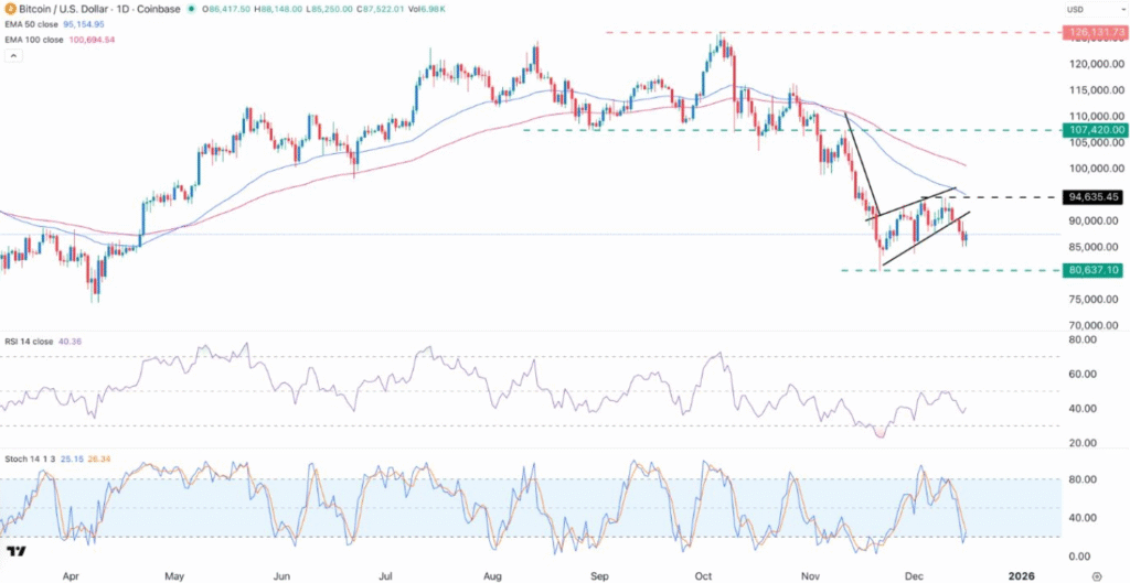 Additionally, BTC/USD has moved below key Exponential Moving Averages (EMAs), including the 50-day and 100-day EMAs. This is a critical technical signal, suggesting that downtrend momentum is likely to persist in the near term.