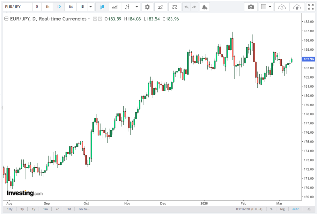 For now, the EUR/JPY pair remains near the 184.00 threshold, reflecting a market environment characterized by policy uncertainty, geopolitical risks, and shifting investor sentiment. As traders evaluate these competing forces, volatility in the cross is likely to remain elevated in the sessions ahead.