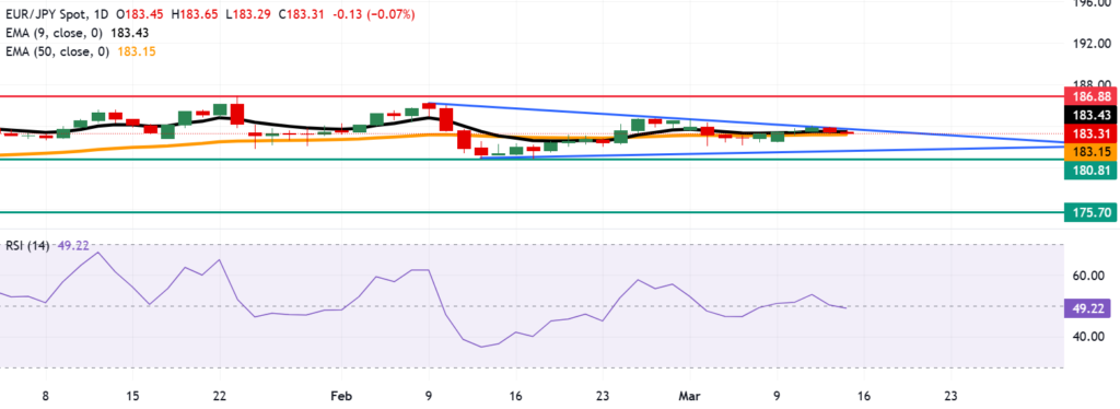 EUR/JPY’s price action indicates a cautious market sentiment, with resistance near 183.43 providing a critical test of strength. The 50-day EMA support at 183.15 will likely determine whether the pair maintains its upside potential or resumes a downward trajectory.