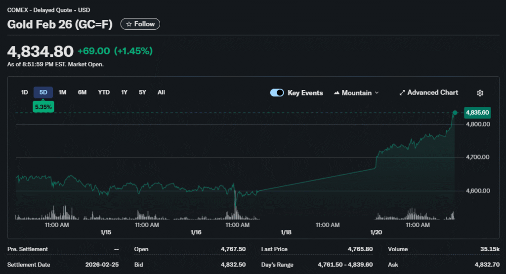 The move above $4,600 triggered additional buying from momentum traders. Price action entered a discovery phase with no overhead resistance. Technical analysts project extensions toward the psychological $5,000 level.