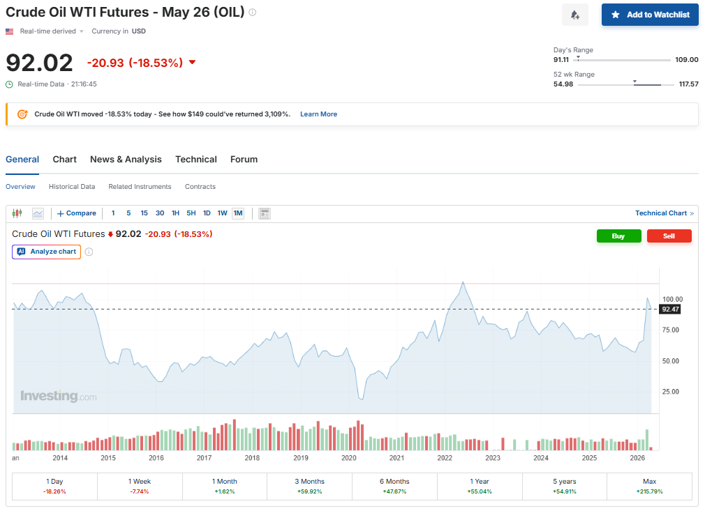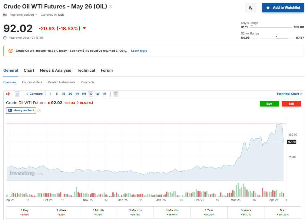 Oil markets responded quickly once the ceasefire was confirmed. U.S. West Texas Intermediate futures dropped approximately 18%, settling near $92.50 per barrel, while Brent crude futures declined by more than 16%, reaching around $91.25 per barrel. This marks one of the sharpest single-day corrections since April 2020.