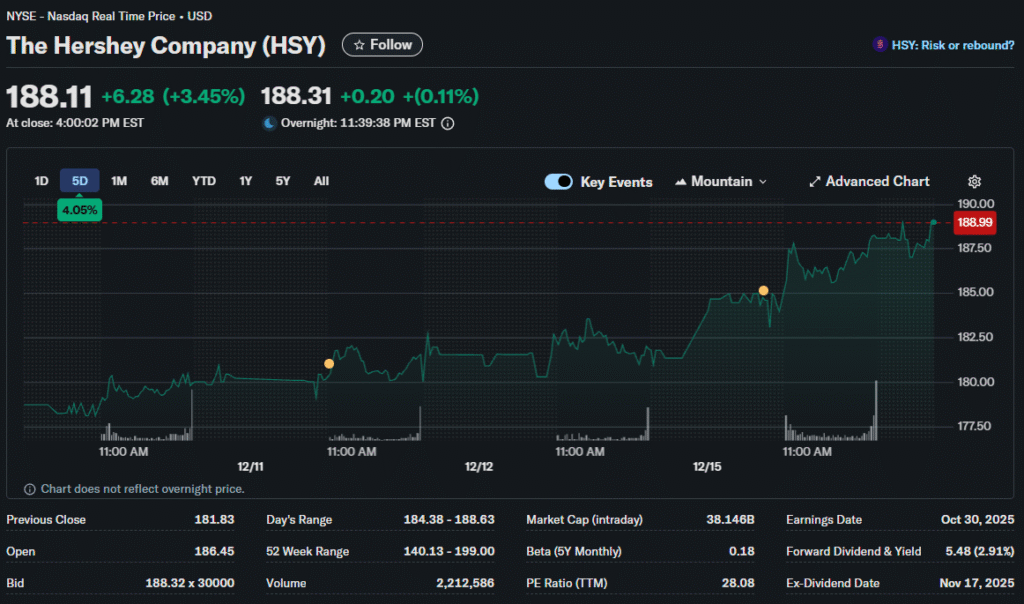 Implied upside of 16% to Morgan Stanley’s target provides compelling risk-reward. Defensive consumer staples rarely offer double-digit return potential, making Hershey attractive relative to alternatives.