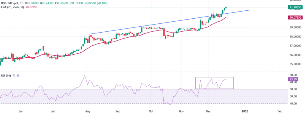 From a technical perspective, USD/INR remains firmly above its 20-day Exponential Moving Average (EMA), reinforcing the bullish bias. The upward-sloping 20-day EMA at 90.0726 is acting as a key support level, with any pullbacks likely to hold at the first test of the average.