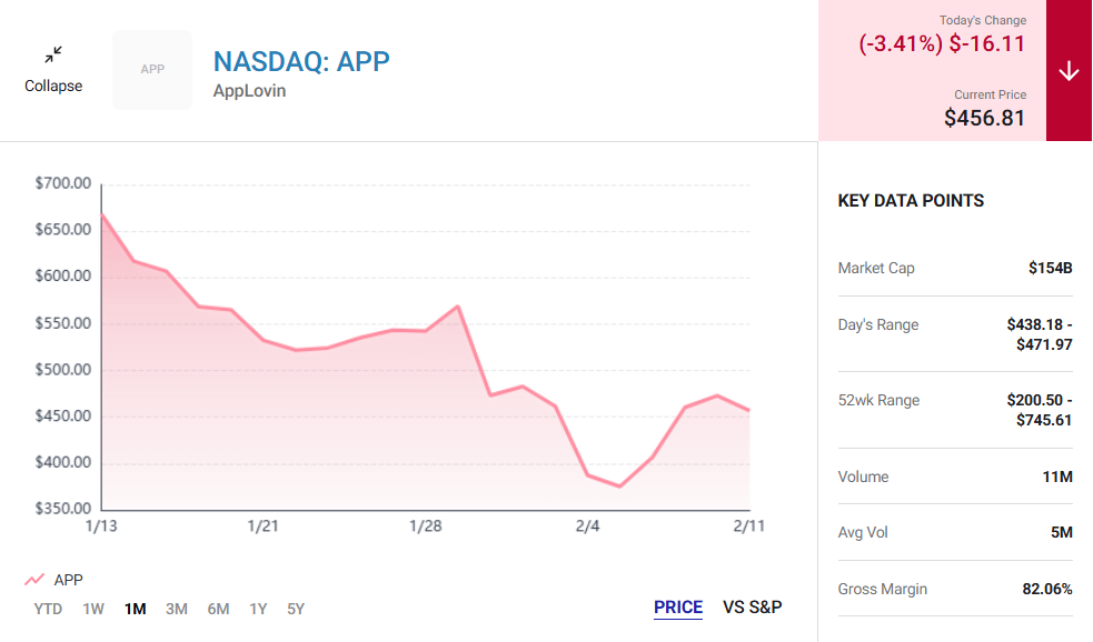 AppLovin’s stock had been on a positive run leading up to the earnings report, rising nearly 12% over the past five days. However, with the Q4 report now behind us and the Q1 2026 forecast not meeting market expectations, the stock seems to have gotten ahead of itself.
