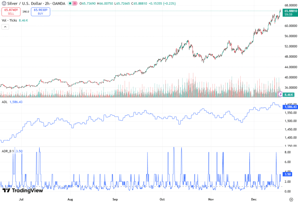 The XAG/USD pair is trading at $65.97, almost 3.5% higher than the day’s opening price, indicating strong bullish momentum. A closer look at the 4-hour chart reveals a well-defined ascending trend line originating from $48.57 lows in mid-November. This trend line currently provides robust support near $63.12, reinforcing the bullish bias.